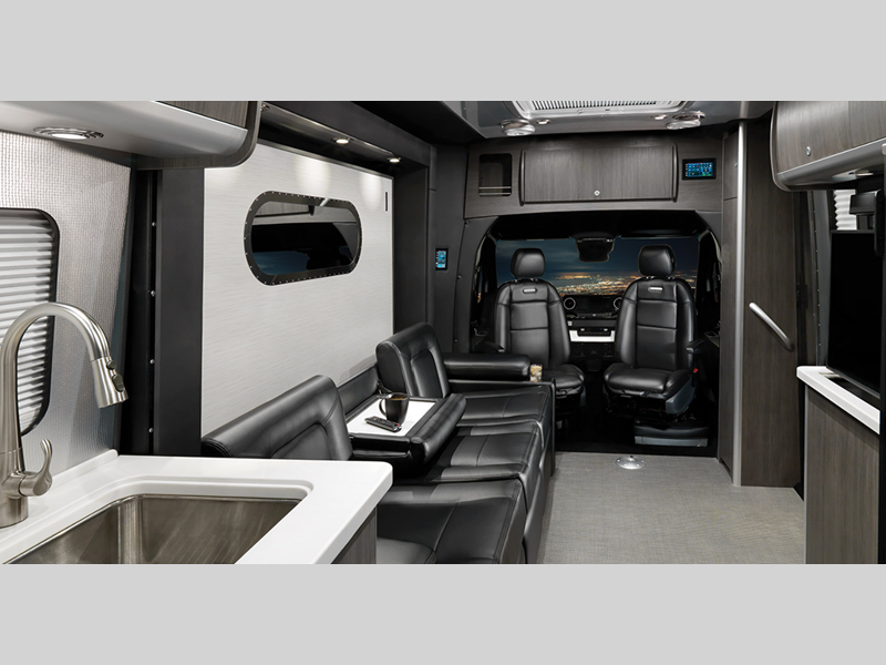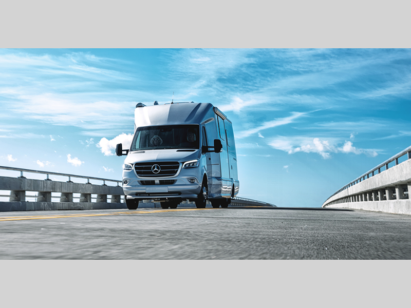 The coach is built on a Mercedes-Benz Sprinter van chassis, and includes active safety systems that automatically provide additional safety on the road such as active brake assist, driver attention assist, and active distance assist, distronic plus. The interior offers a cockpit with advanced in-dash technology and heated, swivel driver/passenger seats, plus the lavatory provides a stand-alone, corner shower with teak wall inlay, a Kohler faucet, shower head and sink, and a riveted aluminum porthole door.