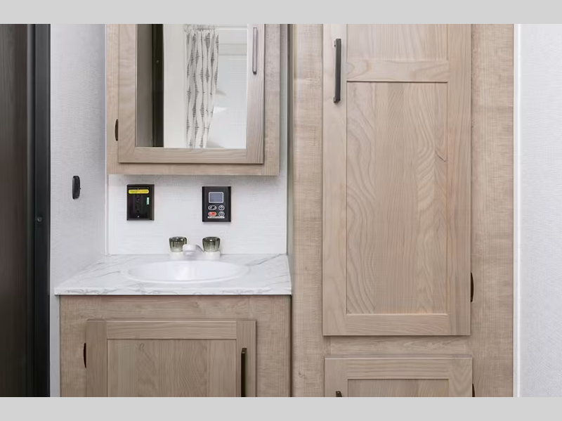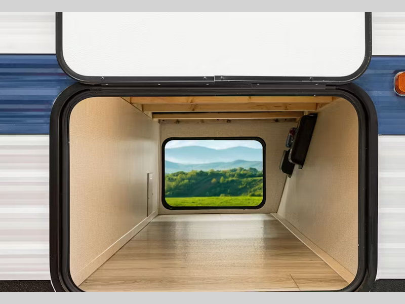 Each model features an 8' wide construction, an AlphaPly TPO roof membrane, and a flat front metal with tough coat for added protection. You will also appreciate the pass-through storage compartment outside, along with a power tongue jack and power awning with LED lights. Inside, there is LED lighting throughout, blackout night shades, seamless pressed membrane countertops and many more comforts.